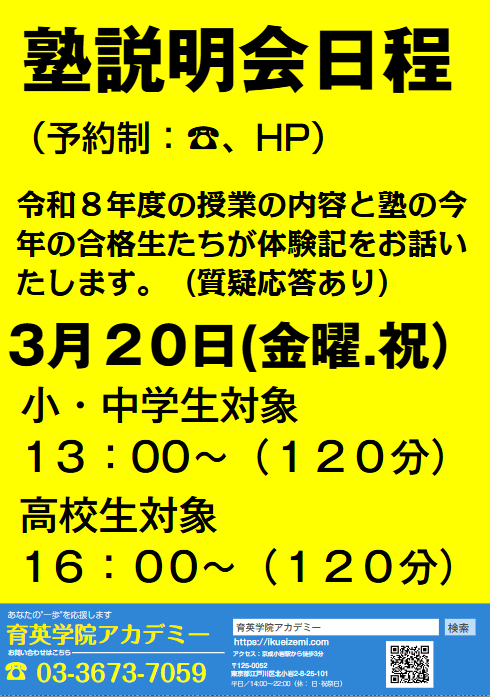 3/20(金・祝)の入塾説明会のお知らせです。
